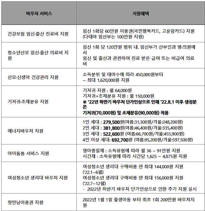 | 첫만남 이용권 지원 | 2022년 1월1일 출생아동 부터 최초 200마원 바우처 지원 |