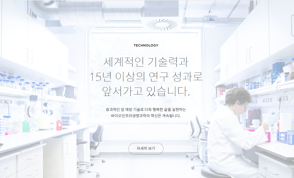 2001년 ㈜바이오인프라생명과학을 설립한 이후 바이오-의료 분야의 핵심 기술인 바이오마커 발굴과 바이오인포매틱스 기술의 융합을 독창적으로 시도하여 세계적 수준의 암 사전검사 기술을 보유하게 되었습니다. 또한 기존 암환자를 대상으로 혈액에서 전이 및 재발 여부를 체계적으로 모니터링하는 기술과 암 유전자 치료제 기술도 개발 중에 있어 다가오는 초고령화 시대에 증가하고 있는 질환인 암 퇴치에 일익을 담당하고 인류의 건강증진에 이바지하고자 최선을 다하고 있습니다.