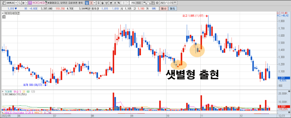 샛별도지형 캔들과 비슷한 모양을 하락추세에서 나타 나는 형태
