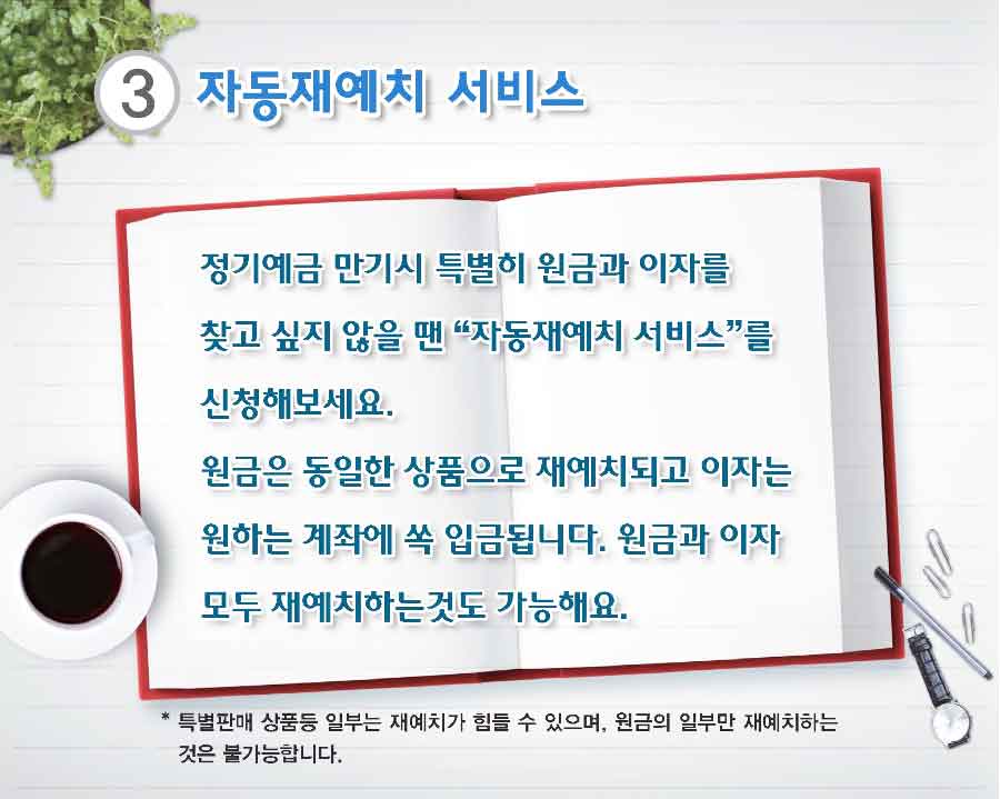 정기예금 만기 시에 원금과 이자를 찾고 싶지 않을 때는 자동 재예치서비스를 신청하시면 됩니다. 원금과 동일한 상품으로 재예치되고 이자는 원하는 계좌에 쏙 입금됩니다. 원금과 이자 재예치하는 것도 가능합니다.