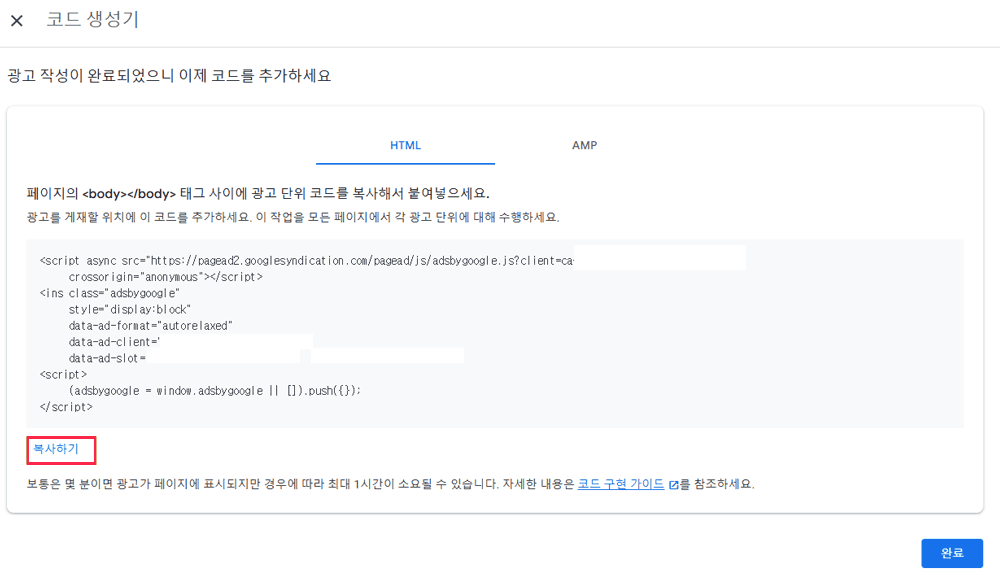 - "광고 코드 생성"을 클릭하고 HTML 코드 복사