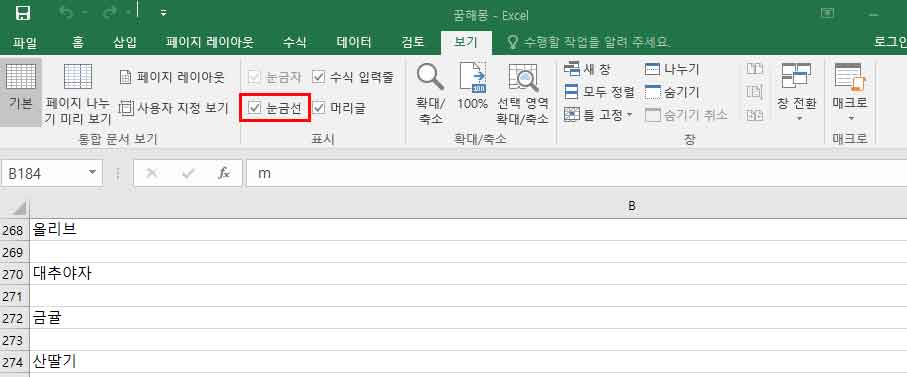 데이터가 입력된 탭을 클릭한 후, 붙여넣을 범위를 지정하고 복사(Ctrl+C)를 누릅니다. 이때 주의할 점은, 그림으로 붙여 넣기는 눈금선도 복사하므로, [보기] – [표시] – [눈금선] 체크를 해제하는 것이 좋습니다. 눈금선을 해제하지 않으면 눈금선까지 복사되어 그림으로 나타나기 때문입니다.