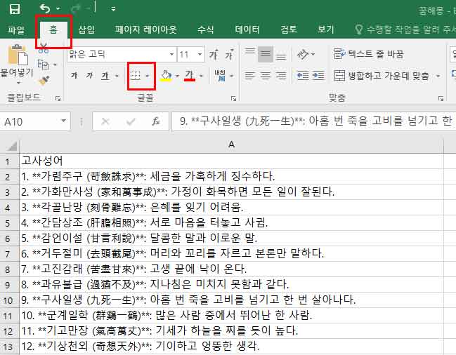 1. 홈 메뉴에서 테두리 삭제