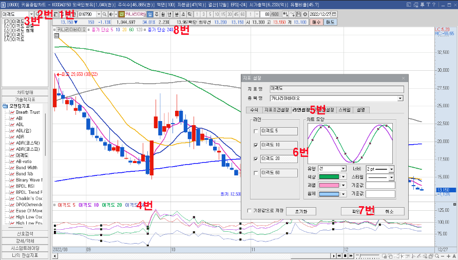 4번을 더블클릭하면 박스가 뜨는데 5번 라인설정 클릭해서 이격도10,이격도 20만 남겨두시고 6번 체크해주시고 7번 확인 버튼 을 누르시면