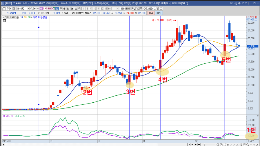 추세가 우상향에서 2번 과4번같은경우에는 오른던 주식이 내려서 20일선을 지지하고 오를 준비를 하고 있는 자리이고