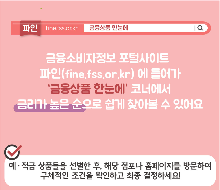 금융 소비자 정보 포털 사이트 파인에 접속하여 금융 상품 한눈에 코너에서 금리가 높은 순으로 쉽게 찾아볼 수 있습니다.