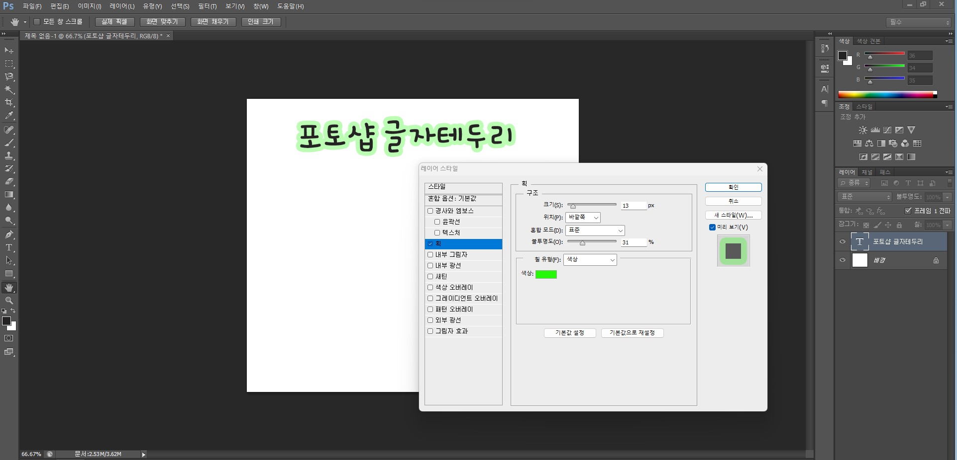 포토샵에서 글자 테두리입히기 입체형 만들기를 위해서는 다음과 같은 단계를 거쳐야 합니다.