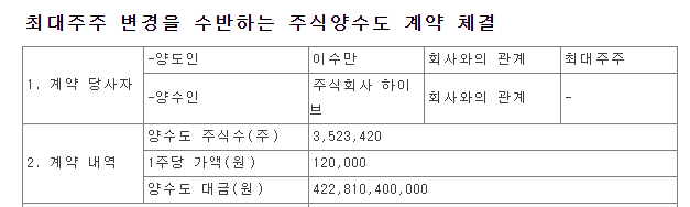10일 금융감독원 전자 공시에 따르면 하이브는 다음달 이수만 전 프로듀서의 에스엠엔터 주식 중 3,523,420주를 12만원에 양도하는 체결을 하였다.