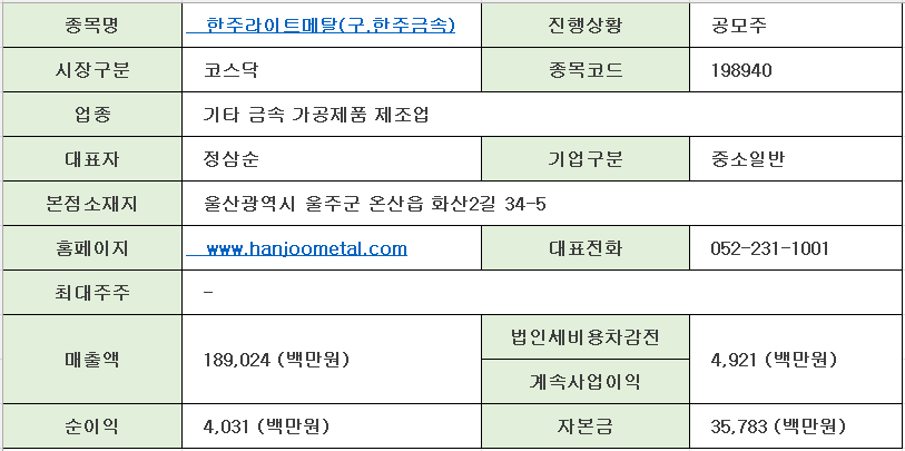 1.한주라이트메탈 공모정보
