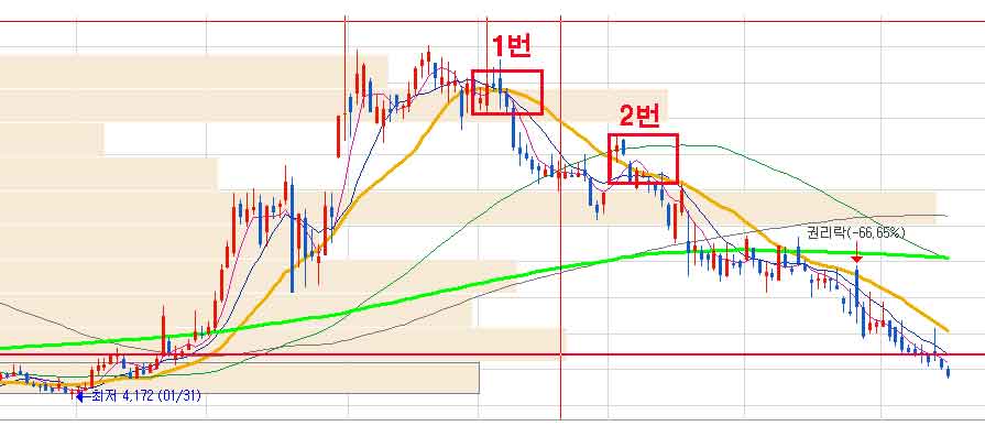 - 20일선 이동평균선 아래로 내리면 매도한다.